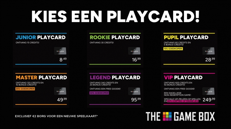 Met onze handige PLAYCARD speel je super easy op onze waanzinnige games. Je tapt met je kaart op de reader en je kunt direct beginnen. Aan de kassa, de kiosk of via onderstaande buttons zet je het door jou gewenste bedrag op jouw persoonlijke playcard.