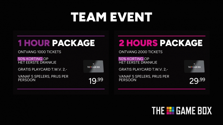 Op zoek naar een compleet verzorgd game-uitje? Met onze arrangementen haal je het maximale uit je bezoek aan The Game Box. Of je nu een verjaardag viert of met je team de strijd aangaat, wij hebben pakketten die zorgen voor actie, fun en onvergetelijke momenten. Kies het arrangement dat bij jullie past en let the games begin.