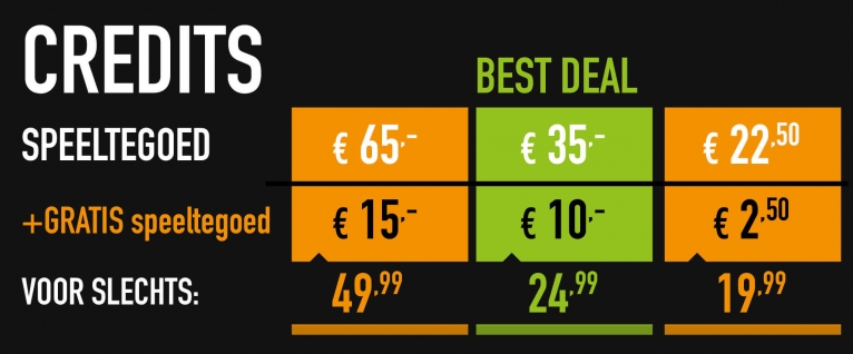 Bovenstaande bedragen zijn exclusief playcardkosten. Heb je nog géén PLAYCARD? Dan kun je deze bij een van onze vestiging kopen. De kosten van de PLAYCARD zijn €1,50 die je direct in speeltegoed terug krijgt. Registreer je je eerste PLAYCARD? Dan ontvang je 10 minuten FREE PLAYTIME op je PLAYCARD! De 10 minuten FREE PLAYTIME bevat een timebreak van 60 seconden tussen de games. Omdat de PLAYCARD ‘rechargeable’ is, kun je deze altijd opnieuw opladen in één van onze vestigingen of online. Het minimale recharge bedrag is altijd €5,-.